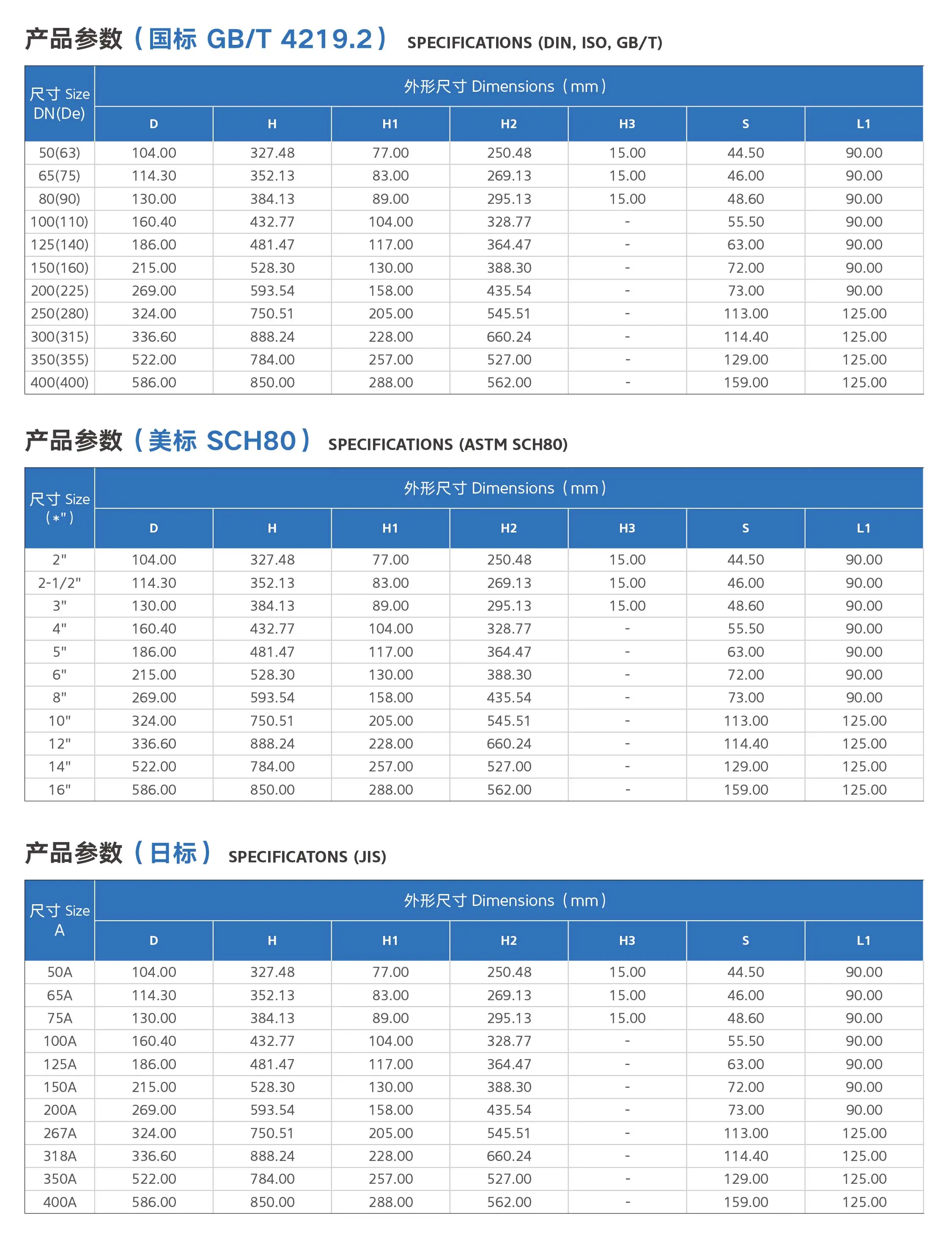 Technical Specification Size(inch) D(mm) L1(mm) H(mm) 1/2" 21.34 17.5 30 3/4" 26.67 18.5 33.5 1" 33.40 22.5 41.5 1-1/4" 42.16 24.0 47.5 1-1/2" 48.26 28.0 54.5 2" 60.32 29.5 63.5 2-1/2" 73.02 44.5 85 3" 88.90 48 96.5 4" 114.3 51 113 Features High Flow...