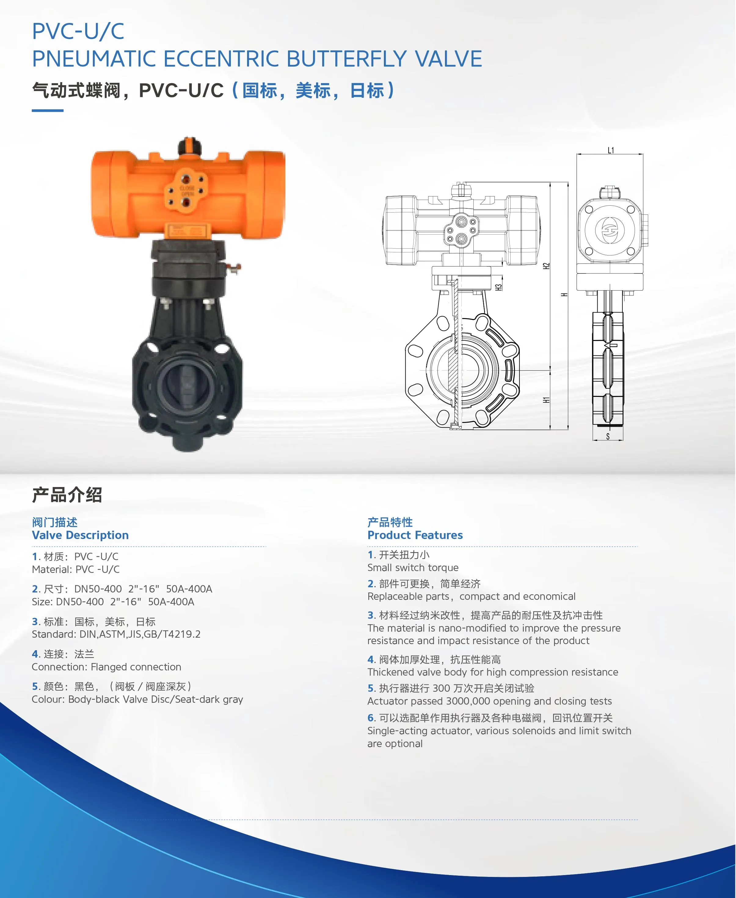 Product Description 1. Material: PVC-U/C 2. Size: DN50-400 2"-16" 50A-400A 3. Standard: DIN, ASTM, JIS, GB/T4219.2 4. Connection: Flanged connection Coour: blackboy-blackVaDi/eaarkgray 5. Color: Black (dark gray valve plate/seat) Technical Parameters...
